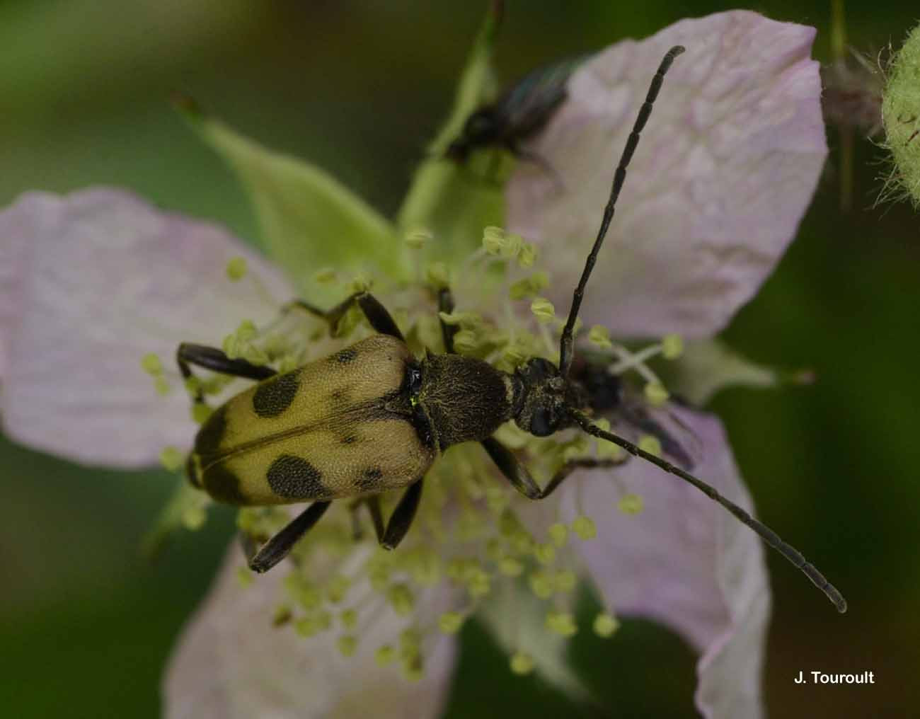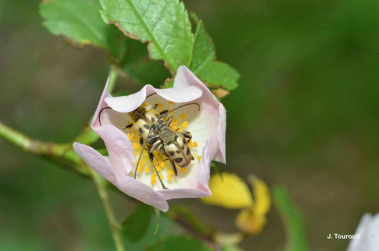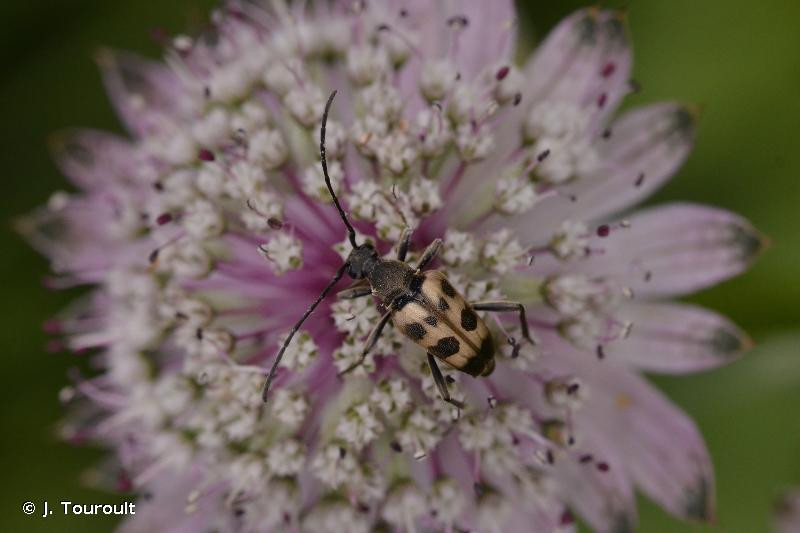 Espèces proches : Cette espèce est plus trapue que d'autres leptures tachetés (Rutpela maculata etc.) mais se rapproche de Judolia sexmaculata et surtout de Pachytodes erraticus, avec lequel elle peut cohabiter dans une partie de la France. Le caractère distinctif le plus simple est la coloration jaune le long de la ligne suturale des élytres, alors que les deux autres espèces ont un net liseré noir.