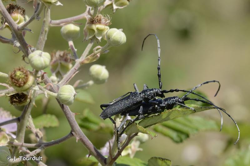 Diagnose : Stature allongée et couleur noir brillant. Antennes plus longues que le corps chez le mâle et la femelle. Pronotum fortement ridé; élytres rugueux; apex élytral arrondi; fémurs postérieurs atteignant l'apex des élytres.