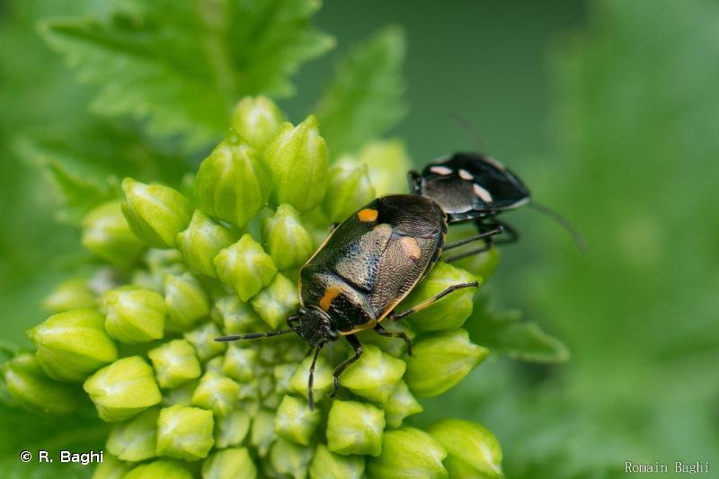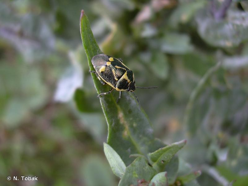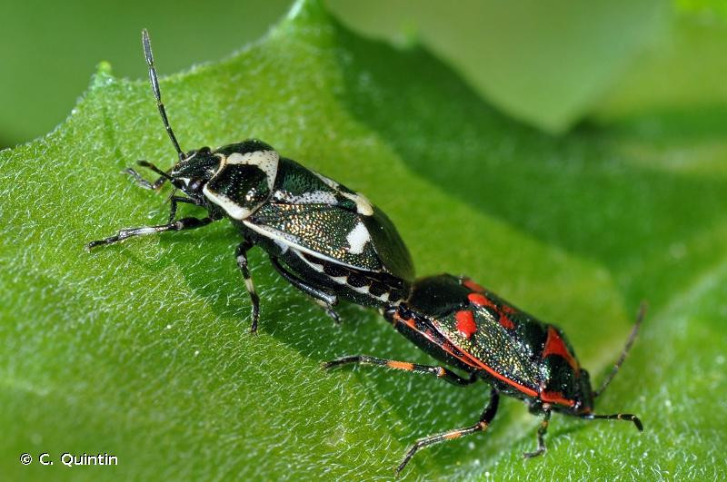 Taille : 5 – 7,5 mm Diagnose : Petite punaise de coloration générale bleu-vert foncé à reflets métalliques, bariolée de taches claires rouges, orange ou blanches. Corie (partie sclérifiée de l’aile antérieure) dont la partie centrale (mésocorie) porte une seule tache claire. Pronotum entouré par un liseré clair, avec une ligne médiane claire formant 2 fenêtres sombres Détermination : Simple. Espèces proches : Malgré des variations importantes de ses couleurs et de la forme de ses taches (30 formes connues), cette espèce globalement verte avec une seule tache sur les mésocories, est l’une des plus faciles à identifier dans le genre Eurydema. Période d’observation : Mars à novembre, avec 2 pics importants en mai et août. Biologie-éthologie : Elle s’alimente sur les fruits d'une cinquantaine de genres de crucifères. Son régime alimentaire a bien été étudié en raison des dégâts qu’elle peut causer aux cultures de choux. Elle est aussi parfois rencontrée ponctuellement sur des graminées et des Asteracées. Biogéographie et écologie : Espèce eurosibérienne présente dans le sud de la Grande-Bretagne, elle remonte au nord jusqu'en Suède à 65° de latitude nord et à l'est jusqu'en Chine et dans toute la Sibérie. Elle est également présente en Afrique du Nord. Elle peut atteindre localement 2 100 m d’altitude et vit dans une large gamme d’habitats : cultures de choux et autres crucifères comestibles (navet, moutarde, colza), friches et prairies fleuries, landes et lisières forestières, bords des chemins, pelouses rases, dunes, marais, bords de rivière boisés, terrains vagues, parcs et jardins. C’est une espèce très commune avec des densités parfois localement importantes, notamment dans les cultures de crucifères.
