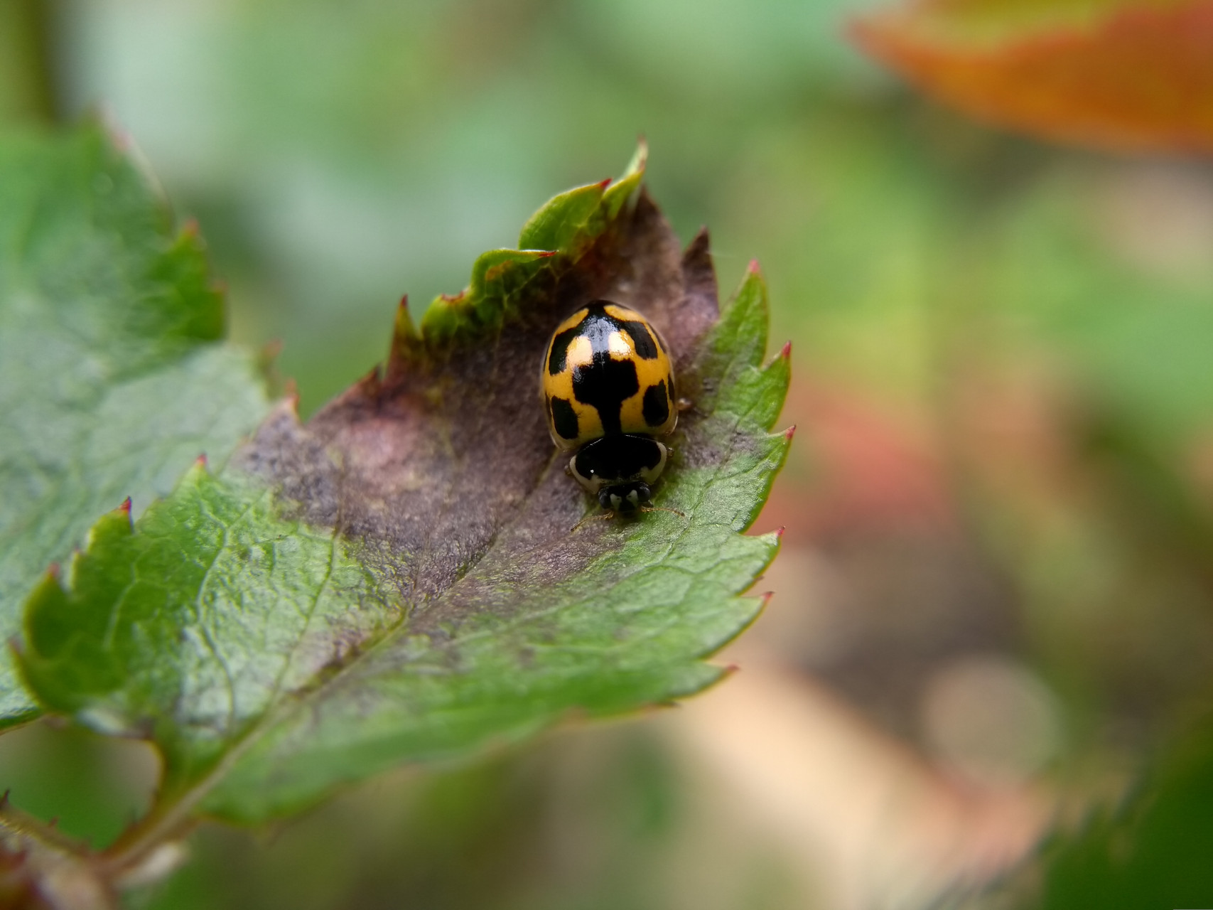 Diagnose : Corps hémisphérique, très convexe, glabre, très luisant, les élytres jaune pâle avec 7 taches noires de forme et d’étendue variables (souvent confluentes) sur chaque élytre et la suture noire. Le bord élytral est légèrement explané. Les appendices sont testacés. Les antennes dépassent peu la base du pronotum et se terminent par une massue de 3 articles peu marquée. Le pronotum est très transverse, jaune crème avec 6 taches noires souvent confluentes, à ponctuation fine et peu dense, à base nettement plus étroite que les élytres. Identification : Très difficile. Confusions possibles : Les formes à taches distinctes se distinguent d’Oenopia conglobata par la forme plus courte, hémisphérique et la couleur de fond jaune pâle. Les formes à taches confluentes se distinguent d’O. lyncea par le bord élytral explané et l’absence de 3 taches en ligne sur le disque élytral. Périodes d’observation (adultes) : Avril à octobre. Biologie-éthologie : La larve et l’adulte sont aphidiphages. Les adultes se rencontrent sur les buissons et les plantes basses. Biogéographie-écologie : Milieux ouverts de toute l’Europe. Références : Fürsch H., 1967 : Clavicornia : Coccinellidae. In Freude H., Harde K.W. & Lohse G.A., Die Käfer Mitteleuropas. Band 7. Krefeld, Goecke & Evers: 227-278.