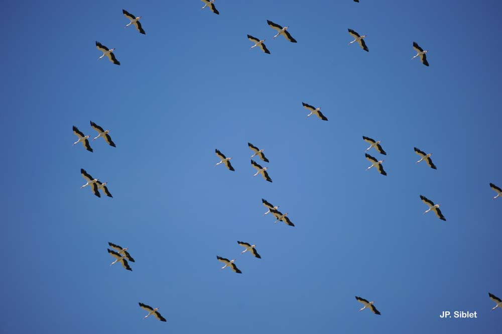 Normalement, les nicheurs ne s’éloignent que de quelques kilomètres du nid. La Cigogne blanche est grégaire, bien qu’elle niche le plus souvent isolément. Le même couple peut nicher plusieurs saisons de suite sur le même nid. Toutefois, il semble que la fidélité au nid soit plus importante que celle au partenaire. Le mâle, qui revient le premier sur le site, accepte souvent la première femelle qui se présente. La parade, dont l’élément le plus évident est le balancement de la tête d’avant en arrière, s’accompagne de claquements de bec.
