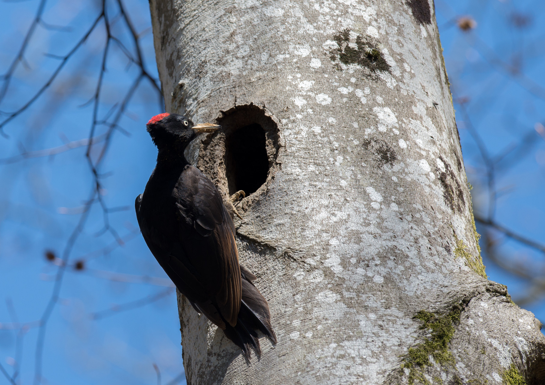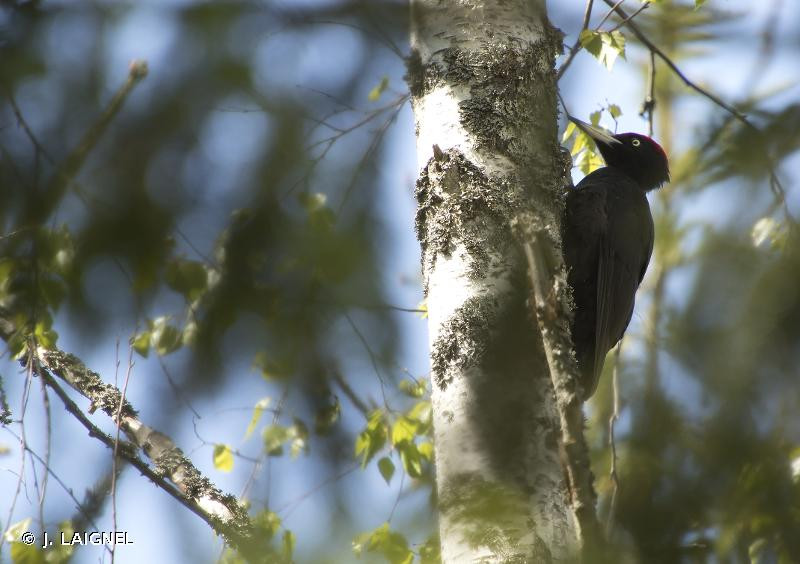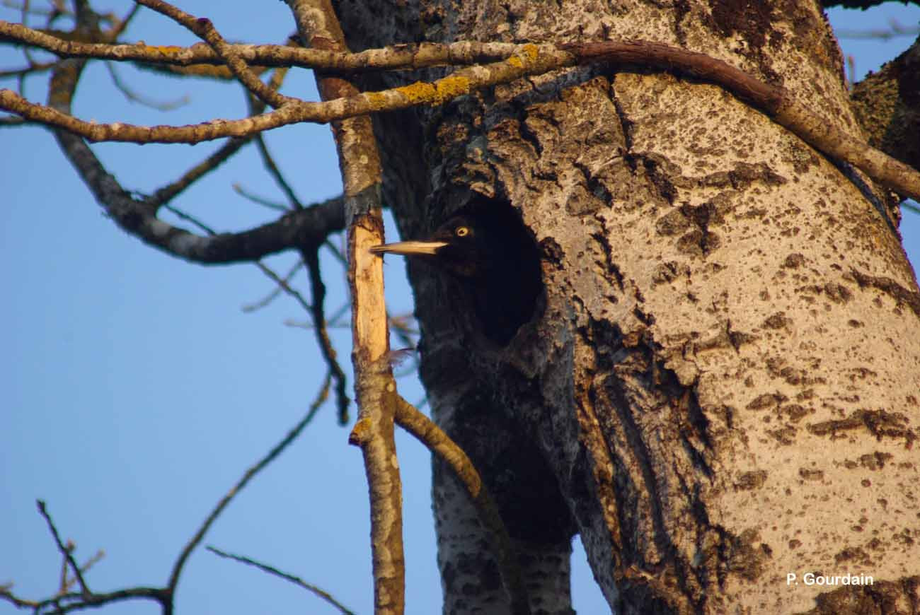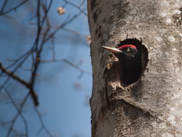 L’espèce est solitaire. Mâle et femelle ont des territoires séparés ou se chevauchant en période internuptiale. La formation du couple débute tôt, la sélection du site et l’excavation du trou de nid commençant dès la mi-février. Dans la plupart des cas, le couple n’est uni que pour une seule saison, de l’hiver à l’été. Les oiseaux âgés restent fidèles à un territoire et à certains arbres à cavités. Les territoires sont très grands, souvent de l’ordre de 300-400 ha pour un couple, parfois moins de 100 ha dans les habitats les plus favorables.