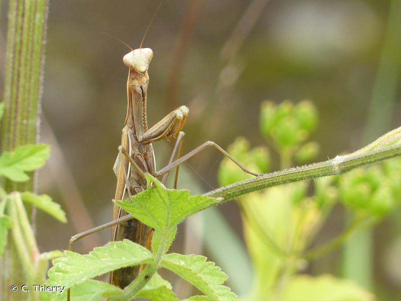 Insecte de grande taille, de coloration très variable selon les individus, de beige clair à brun foncé, en passant par le vert. Les pattes ravisseuses antérieures sont très bien visibles. Les ailes sont développées pour le vol uniquement chez les mâles. Les femelles ont les ailes un peu plus courtes, elles atteignent à peine l’extrémité de l’abdomen. Le pronotum n’a pas de caractéristiques particulières. Les hanches des pattes antérieures possèdent une macule noire contenant ou non une tache ronde blanche. L’abdomen de la femelle est fusiforme, assez renflé, surtout peu de temps avant de pondre l’oothèque contenant les œufs.